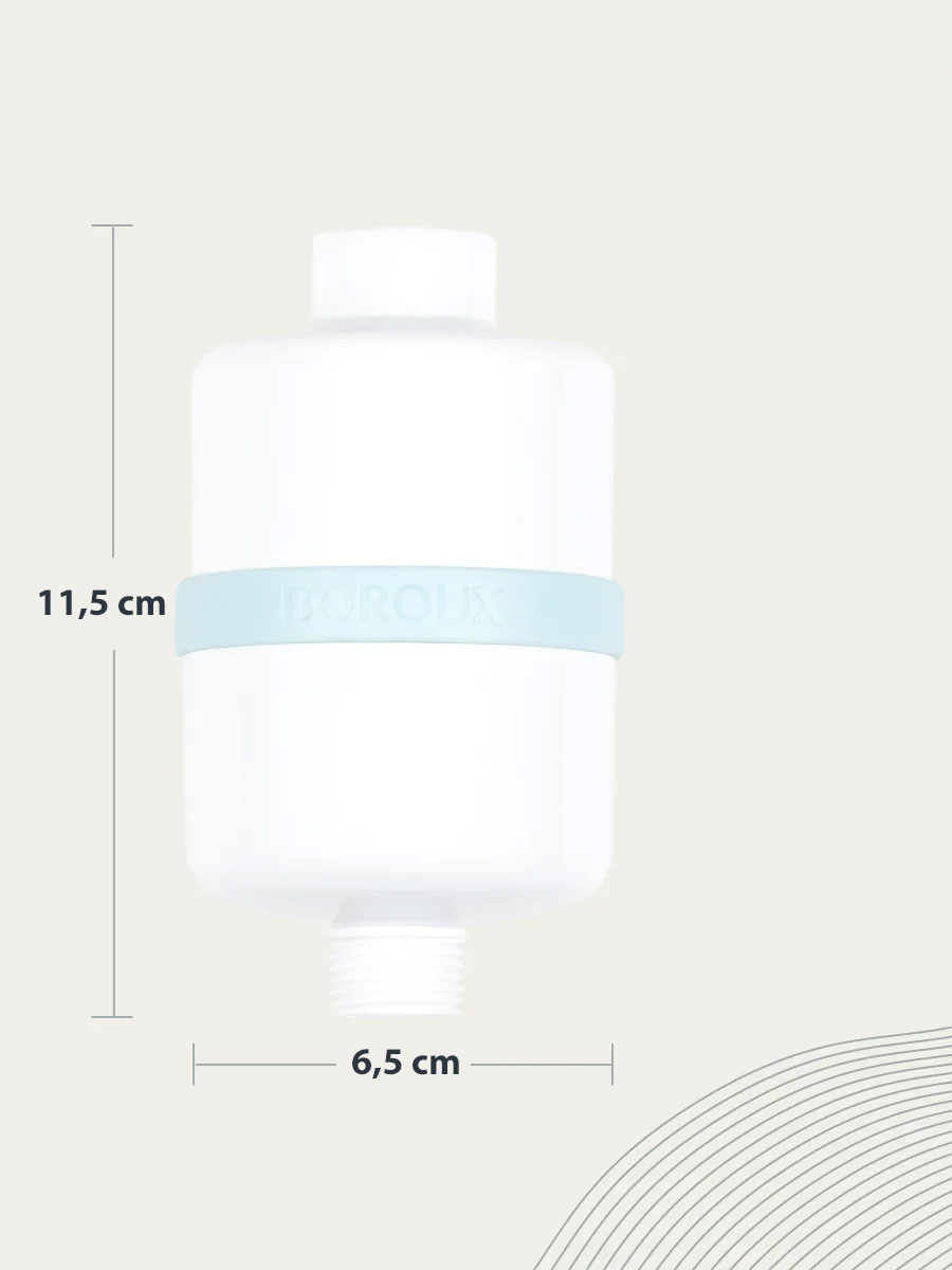 Een betere douche begint bij beter water. De BOROUX douchefilter vermindert de blootstelling aan eventuele chemicaliën, wat helpt om droogheid en irritatie te verlichten, terwijl het de natuurlijke vochtbalans van je huid en de natuurlijke glans van je haar ondersteunt.