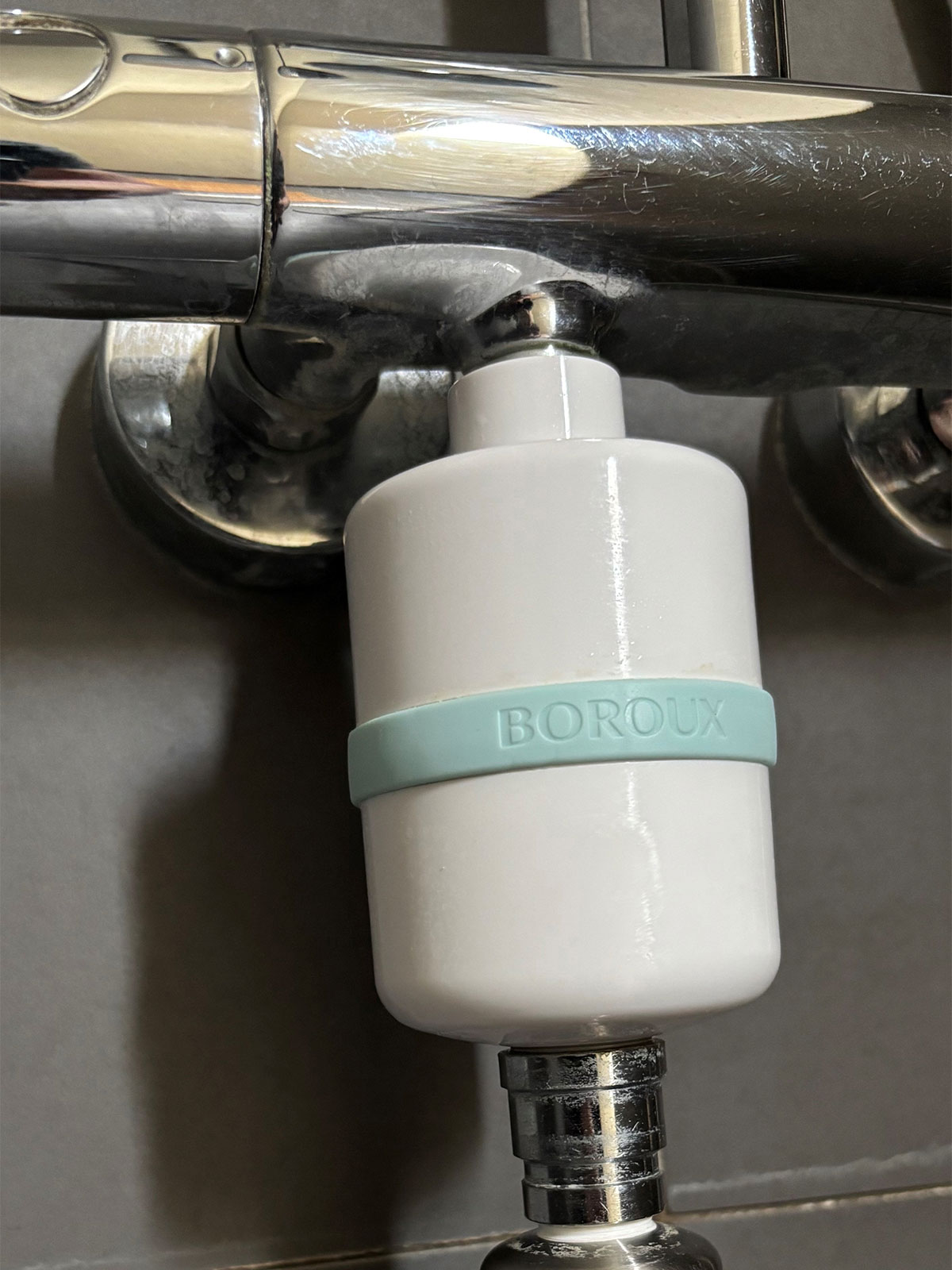 The BOROUX shower filter reduces exposure to chemicals, helping to relieve dryness and irritation. Experience softer hair and softer skin!