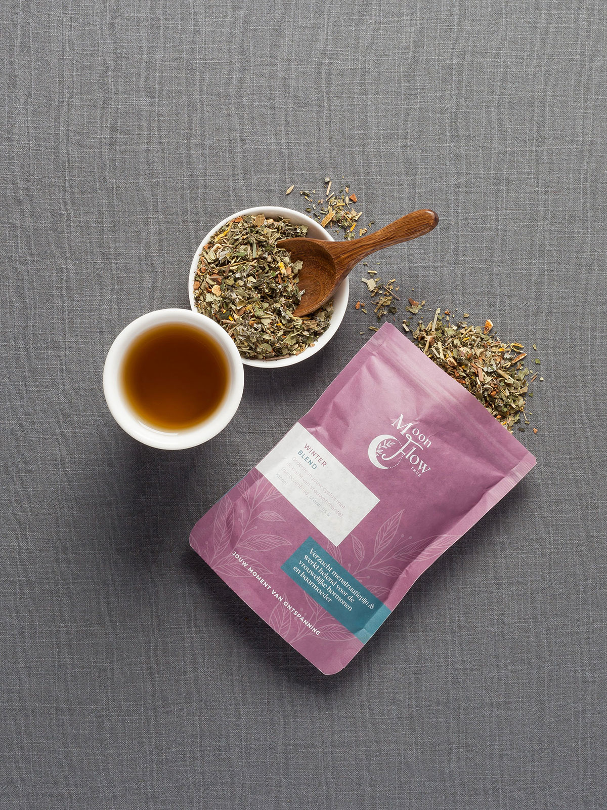 Moon Flow Winter thee is een biologische blend van zorgvuldig geselecteerde kruiden met wat extra kruiden aan toegevoegd voor een winterse smaak.