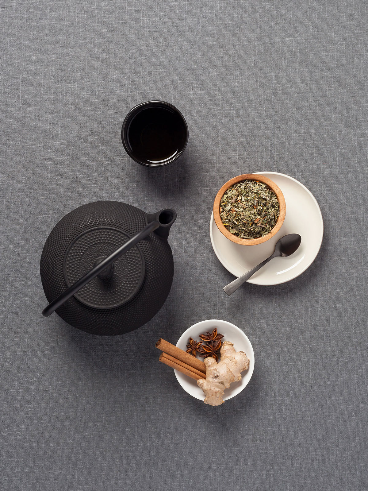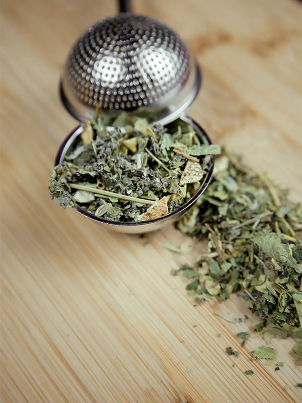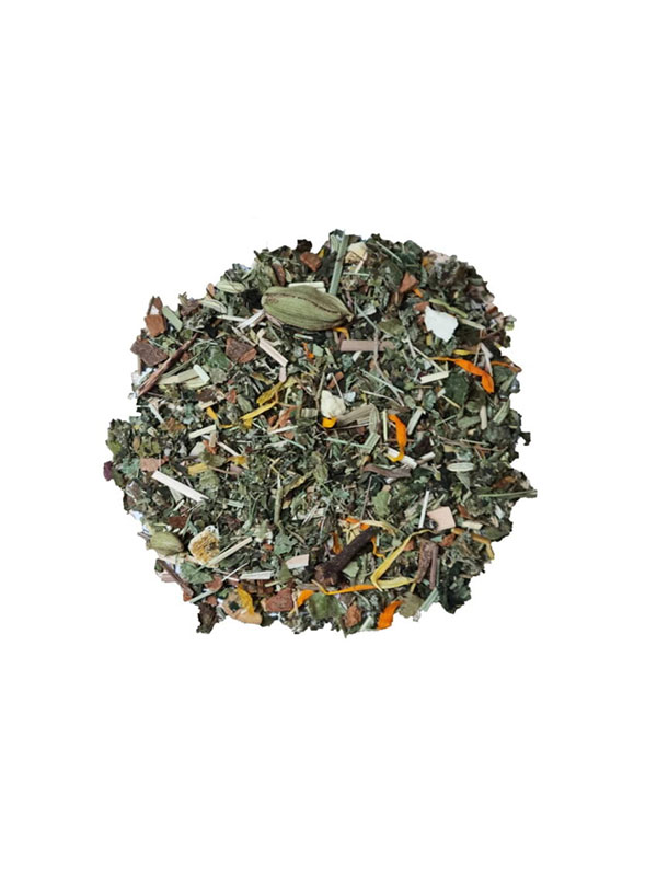 Vrouwenmantel, frambozenblad, sinaasappelschil, venkel, brandnetel, citroenmelisse, citroengras, zonnebloembloesem, kaneel, steranijs, gember, kardemon, kruidnagel