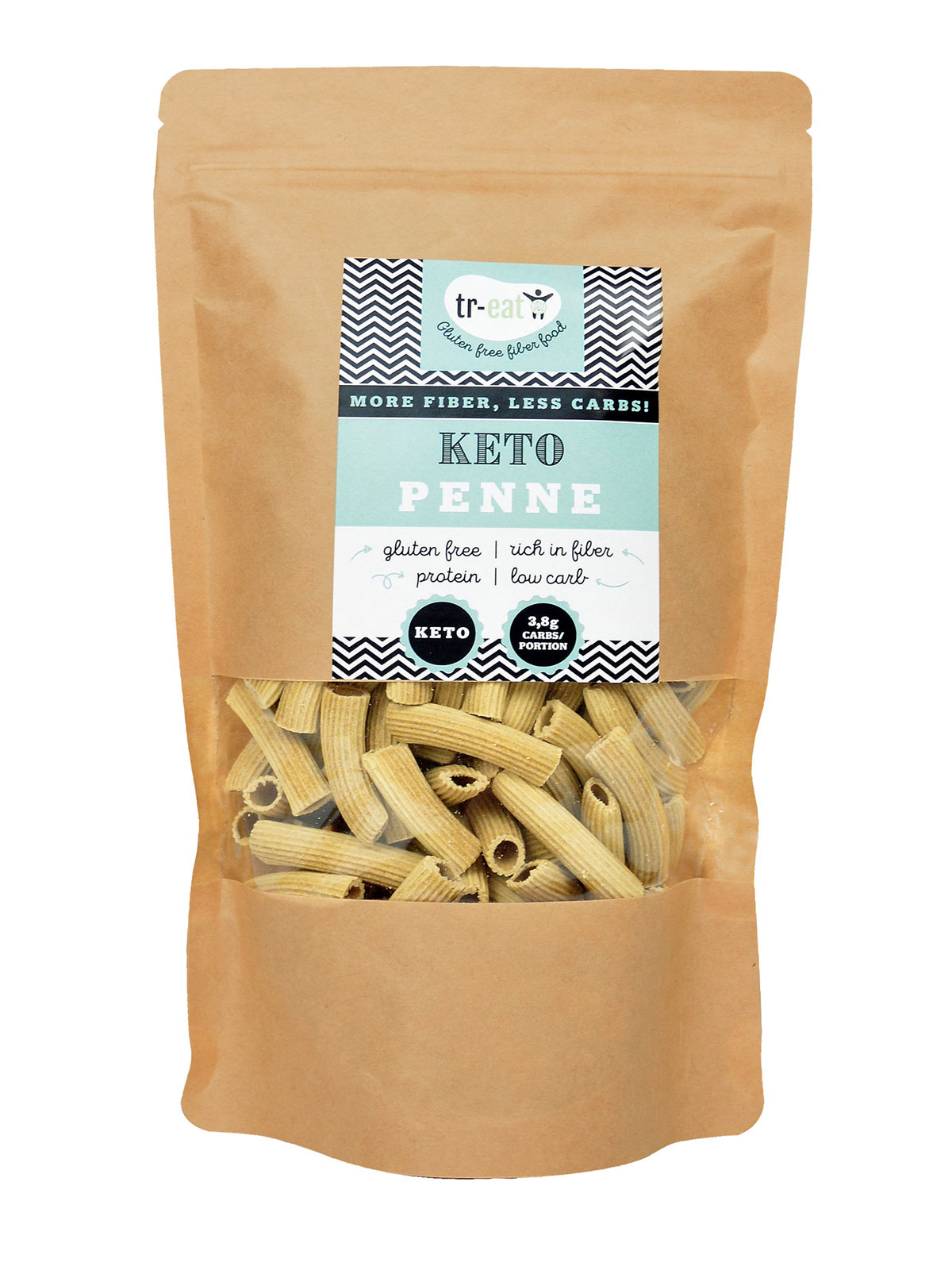 Tr-eat Keto Penne Pasta is de glutenvrije en low carb pasta die je ketose en vetverbranding niet verstoort, slechts 4gr koolhydraten per portie pasta.