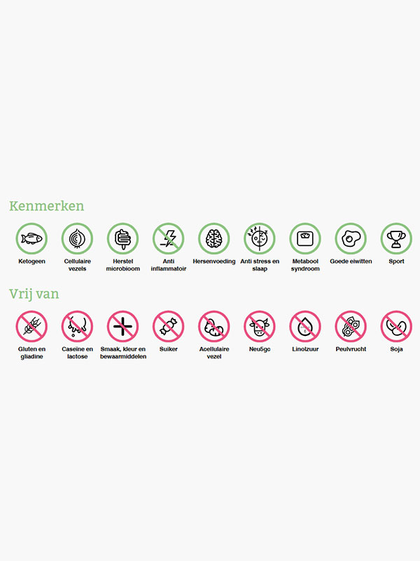 Bamboe vezel, ei, psyllium husk, tapioca, lijnzaad en kurkuma.